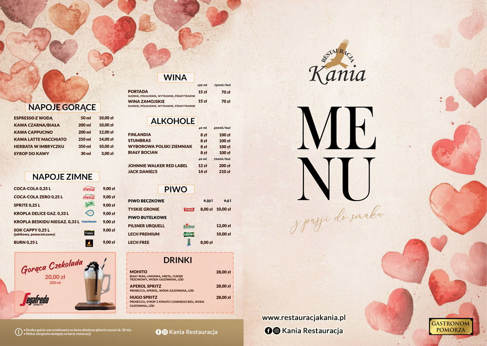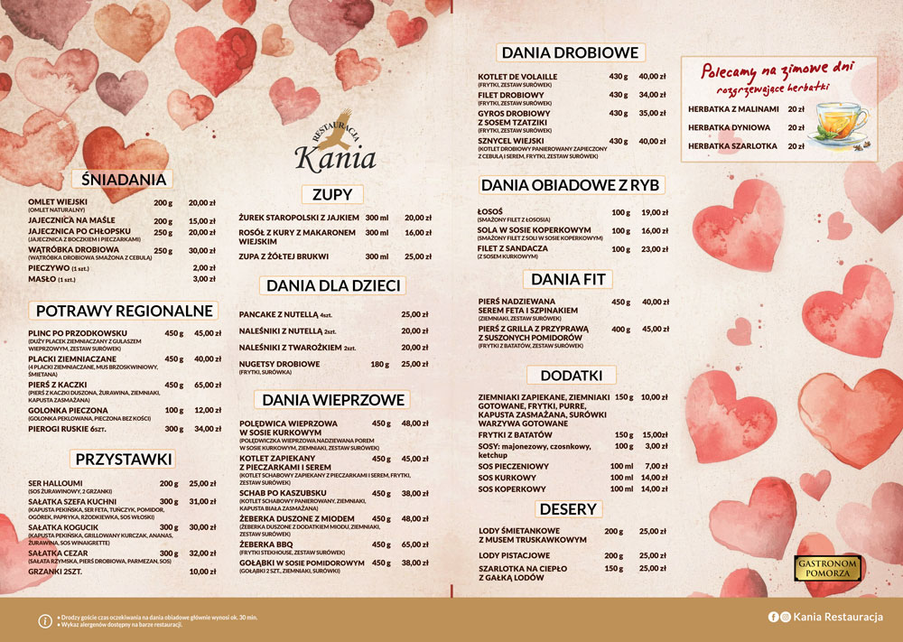 Restauracja Kania wyróżnia się nie tylko doskonałym jedzeniem, ale także wyjątkową atmosferą. Wnętrze jest eleganckie i przytulne, a jednocześnie nowoczesne oraz stylowe. Nasza obsługa jest zawsze uśmiechnięta i gotowa do pomocy, a dania są przygotowywane z najwyższej jakości składników. Organizujemy również imprezy okolicznościowe, takie jak wesela, chrzciny czy urodziny. Dodatkowo, oferujemy usługi cateringowe, dostarczając pyszne jedzenie do biur, domów, na imprezy plenerowe itp. Restauracja Kania mieści się w Przodkowie. Odwiedzając nas, mogą Państwo skorzystać z tego co oferuje okolica – z licznych atrakcji turystycznych.